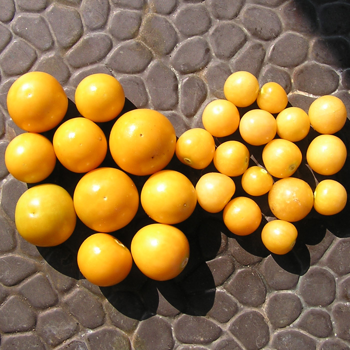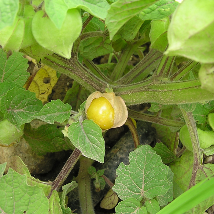 bildet zahlreiche, kirschgroße Beeren, die früher reif und süßer sind als bei der Andenbeere. Der Geschmack erinnert an Ananas. Die Früchte werden geerntet, wenn sie abfallen. Bis 70 cm hohe, buschige Pflanzen.