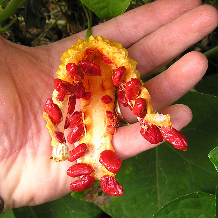 Vergessene Früchte werden mit zunehmender Reife orange, platzen auf und lassen die Samen – in knallrotem Fruchtfleisch – herausfallen. Ein echter Hingucker!
