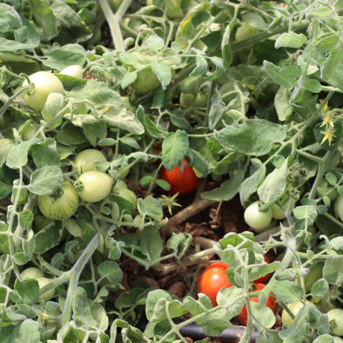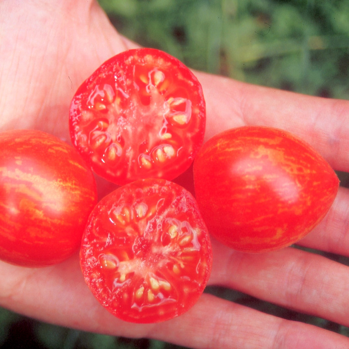 Salattomate. Ungewöhnliche, graugrüne, behaarte Blätter und rote, bezipfelte Früchte mit goldenen Streifen.