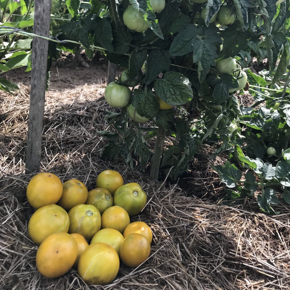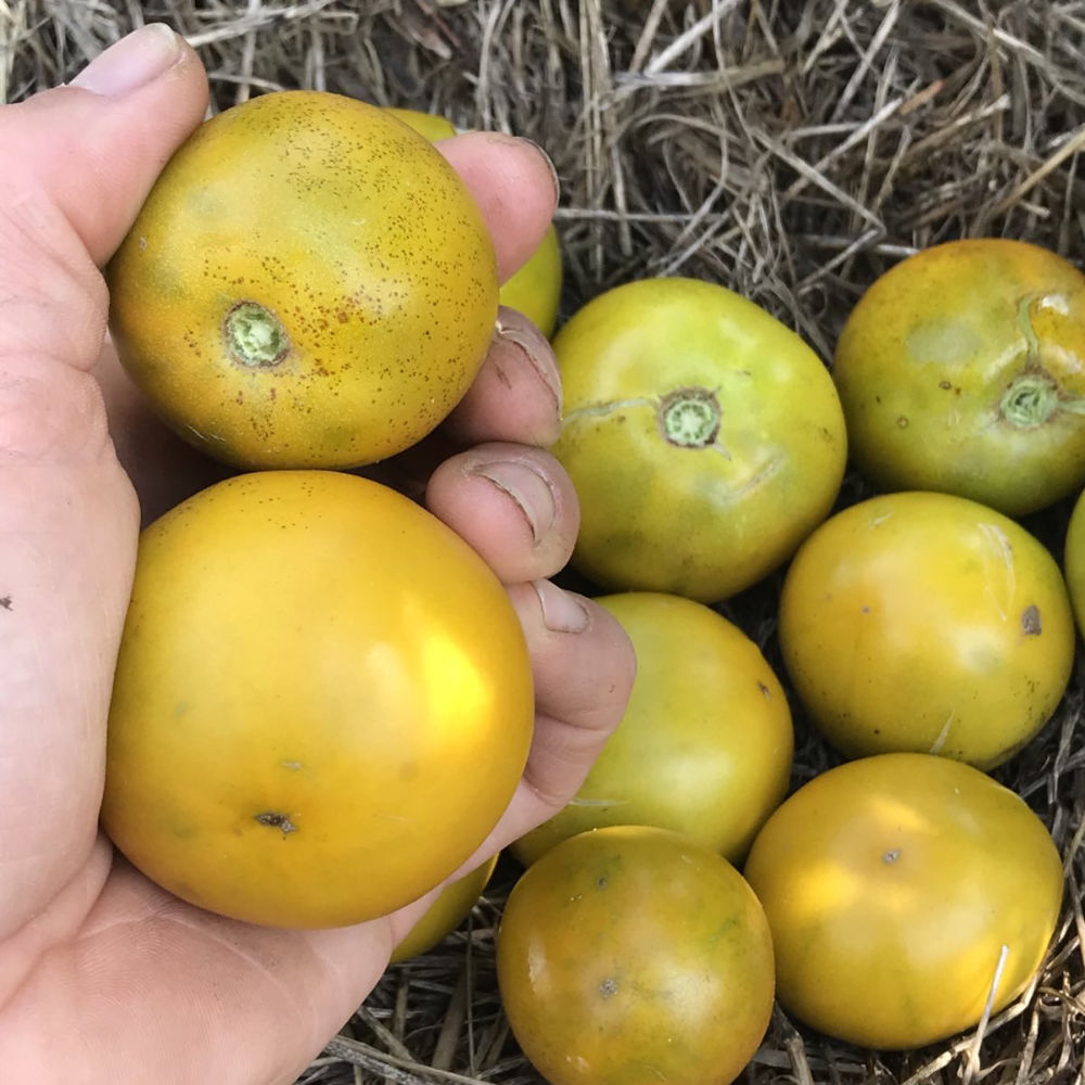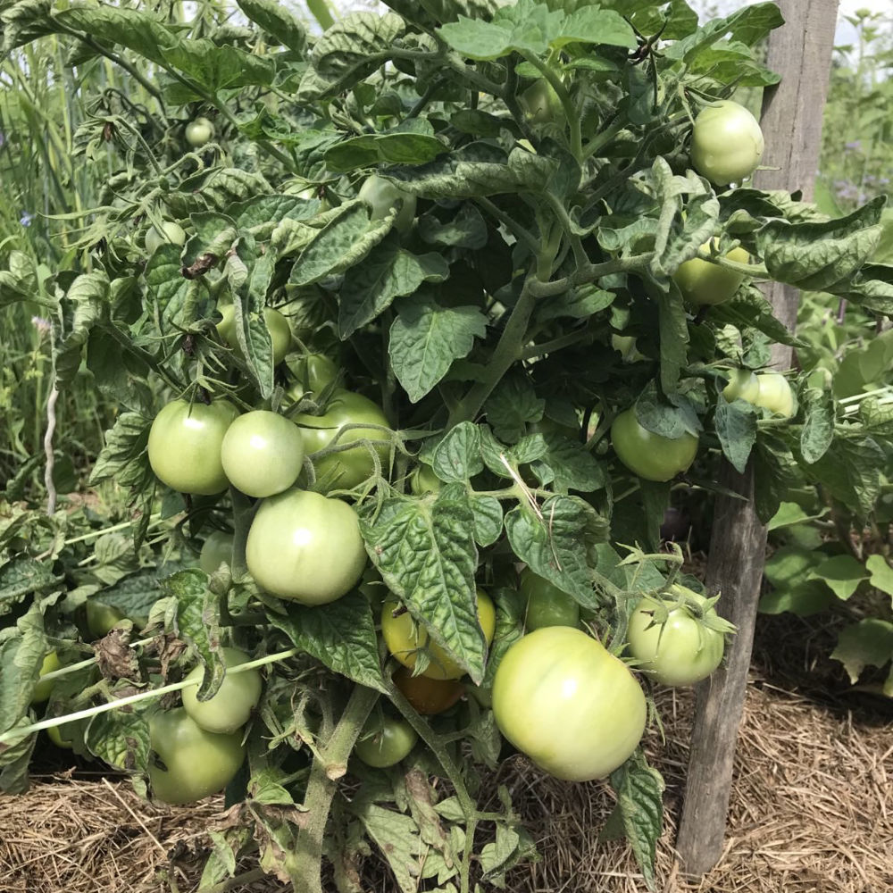 Salattomate. Bildet viele, grün-gelbe, bis zu tennisballgroße Früchte mit süß-säuerlichem Geschmack. Die Pflanzen wachsen aufrecht und werden 60 bis 80 cm hoch.