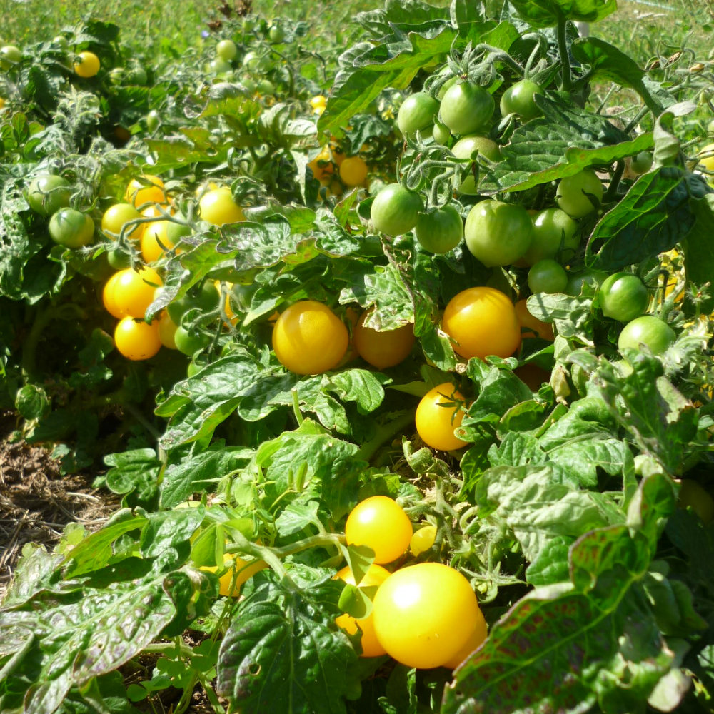 Cocktailtomate. Besonders kleinwüchsige Buschtomate, die sich perfekt für den Topf- und Blumenampelanbau (ab 5l Volumen) eignet. Die gelben, in einem Zwiebelspitzchen endenden Cherry-Tomaten haben zudem einen hohen Zierwert. Aufgrund der besonderen Form Ziersorte.