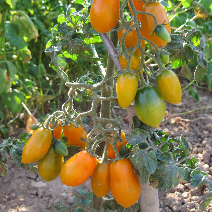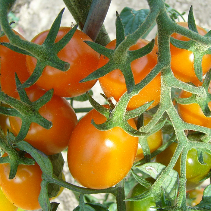 birnenförmige, leuchtend orange Früchte in feinem, dunkelgrünem Tomatenlaub. Aromatisch süßer Geschmack, festes Fruchtfleisch.