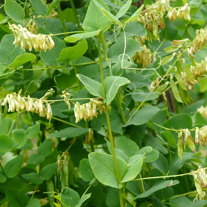 Eine mehrjährige, bis über 2 m hoch kletternde Hülsenfrucht mit blassgelben Blüten und kleinen Schoten mit essbaren Kernen.