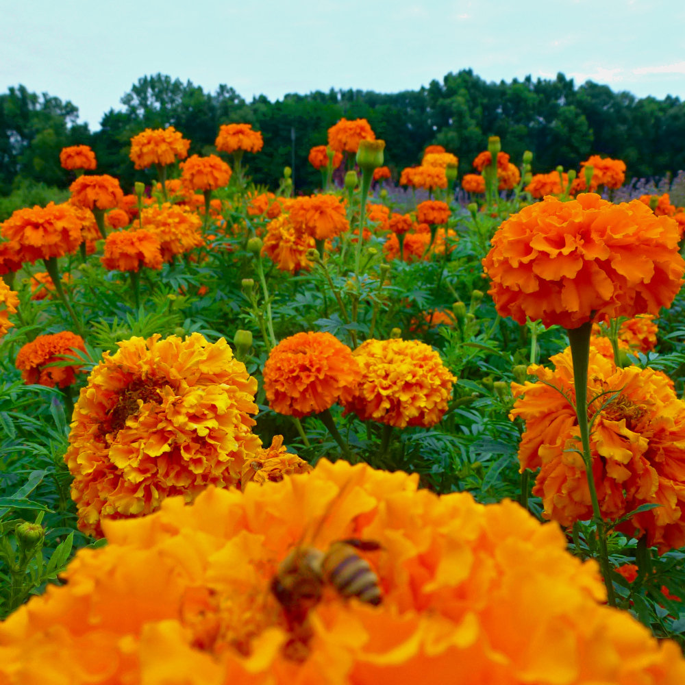 Mischung gefüllter und ungefüllter, leuchtend goldoranger Blüten, die zum Färben von Stoffen und Wolle geeignet sind.