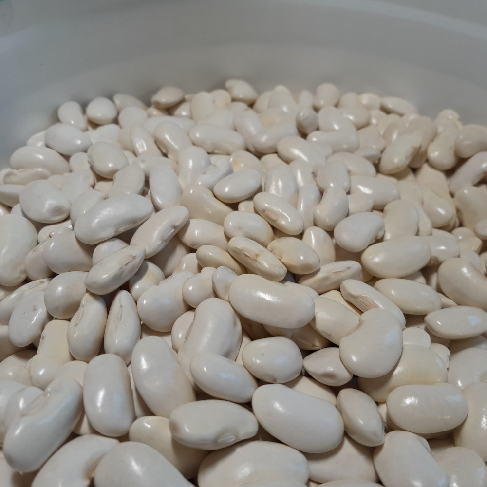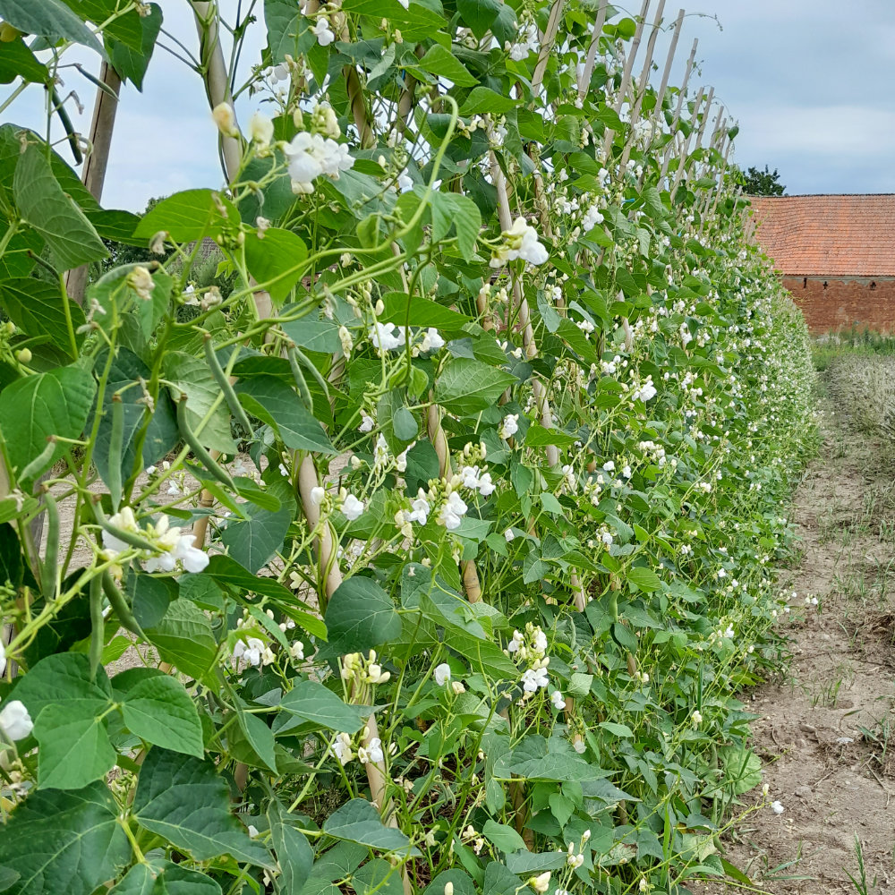 Weißblühende Feuerbohne mit langen fleischigen Hülsen und in Vollreife reinweißen, großen Bohnen. Lokale Sorte aus Nordhessen.