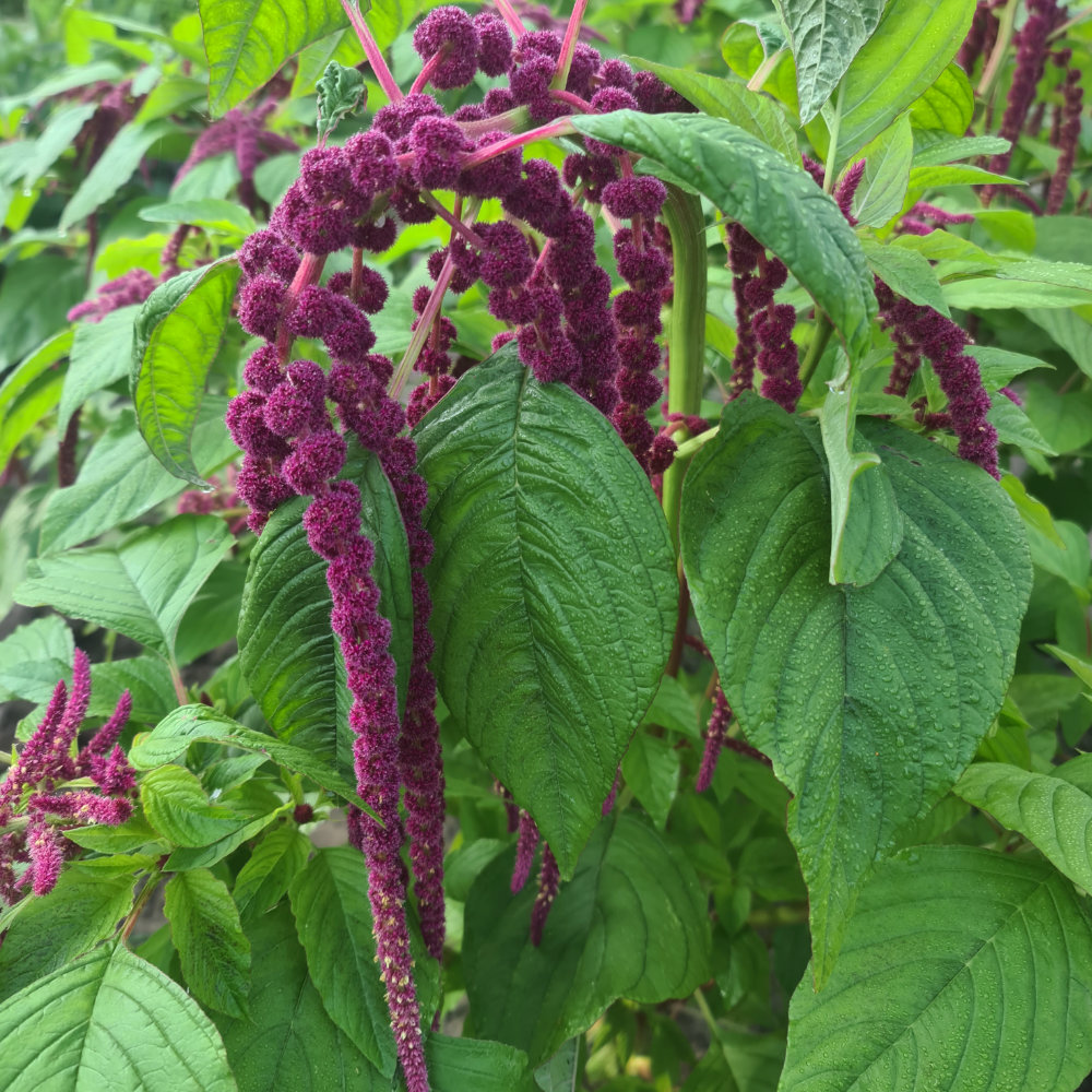 alte, bis 70 cm hohe Ziersorten-Amaranthform, rote, hängende, bis 50 cm lange Blütenstände, Blätter und Samen essbar.