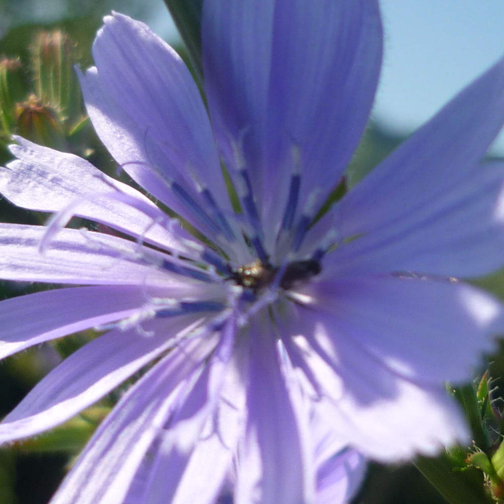 Shoptext: Die hellblau leuchtenden Blüten erfreuen Mensch und Tier gleichermaßen. Mit ihrem hohen Nektarangebot sind sie u.a. für über 80 Wildbienen- und Hummelarten ab Juni bis in den Oktober hinein eine wertvolle Nahrungsquelle. An regnerischen Tagen sowie nachmittags werden die Blüten geschlossen. Im Herbst plündern marodierende Spatzenbanden, Stieglitze und Co. mit Freude die Samenstände. Die bitterstoffreichen, jungen Blätter können als Mischsalatzugabe (siehe auch Radicchio, Catalogna und Chicorée S. QV1) wie auch die Wurzeln geröstet als Kaffeeersatz (siehe auch Kaffeezichorie S. QV2) verwandt werden. Ebenso sind die hübschen Blüten essbar und zum Verzieren von Speisen bestens geeignet. Die Wegwarte liebt sonnige, nicht zu nährstoffreiche, leicht basische, gerne auch sandige Böden.