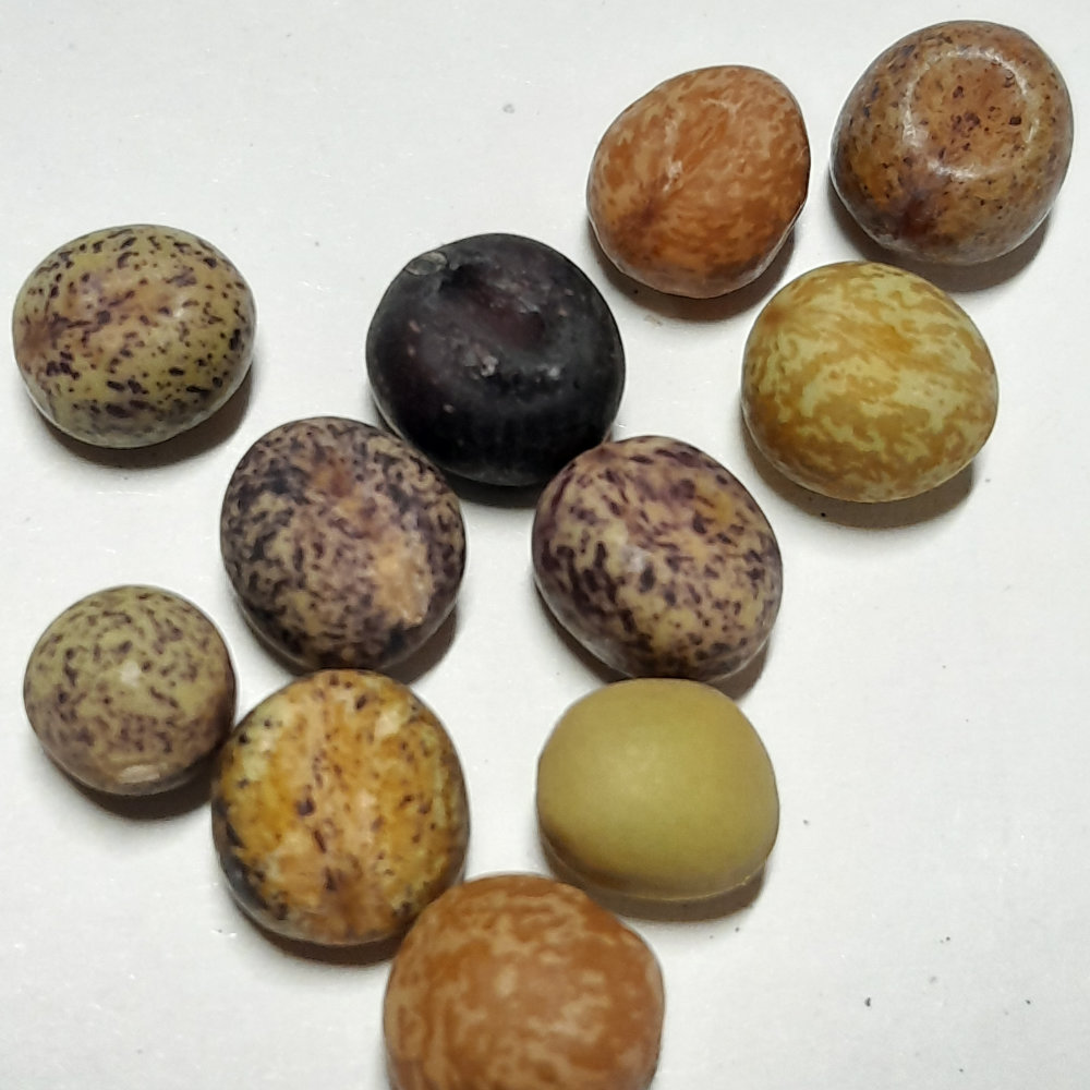Alte, italienische Sorte aus Umbrien. Wuchshöhe 1 m. Pinke und dunkellila Blüten. Kleine Hülsen. Ausgereift bunte, geschmackvolle Körner, die grün, gelb, rot, blau sowie grau und gesprenkelt sind.