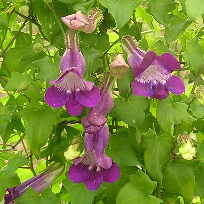Zierlich wachsende Kletterpflanze mit efeu-ähnlichem Laub und unzähligen dunkelvioletten Rachenblüten.