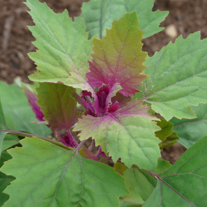 bis über 2 m hohe, einjährige Gänsefußart, Verwendung wie Spinat oder Salat, Blatt teilweise purpurrot, hoher Zierwert.