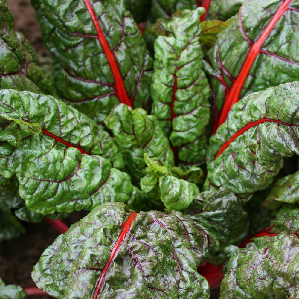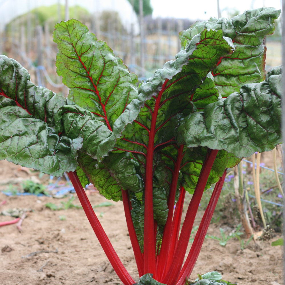 leuchtend rote, schmale Blattstiele mit rot-grünen Blättern.