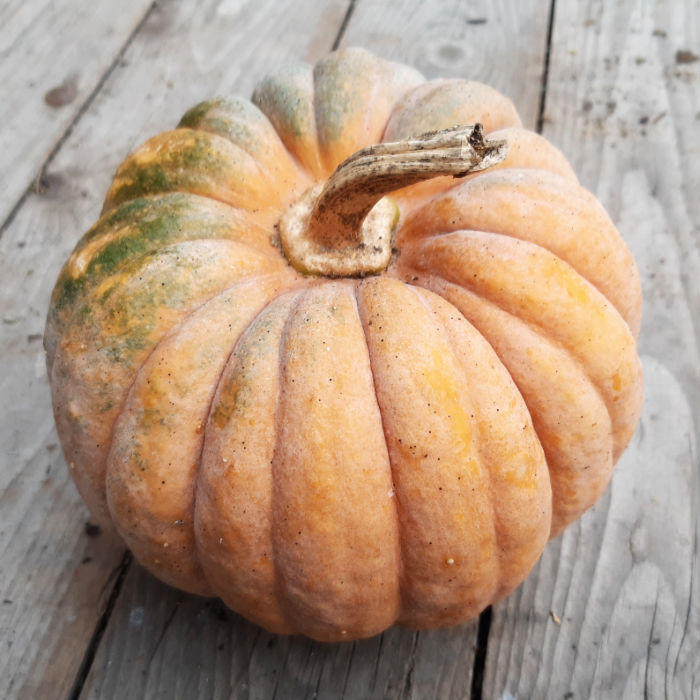 rankend. Früchte 1 bis 1,5 kg schwer, dunkelgrün, stark gerippt, dadurch sehr schöne Kürbisform. Bei Vollreife orangebraun, Fruchtfleisch dunkelorange und süßlich, sehr aromatisch. Verwendbar zum Braten, Überbacken, für Kuchen und Süßspeisen. v Apr. oder s M Mai, 100x100. Inhalt reicht für ca. 6 Pflanzen.