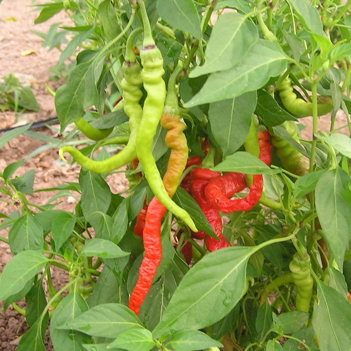 Die leicht gedrehten, ca. 16 cm langen Früchte reifen von hellgrün auf rot. Lombardo ist ertragreich, robust und besonders fürs Freiland geeignet.