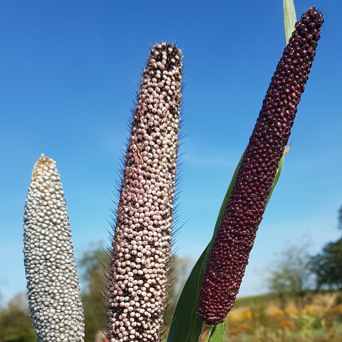 Die dicht besetzten Kolben der Perlhirse erinnern an Rohrkolben und leuchten kurz vor der Reife blau, gelb oder rot. In diesem Zustand sind sie ein echter Hingucker im Garten oder in großen Blumensträußen.