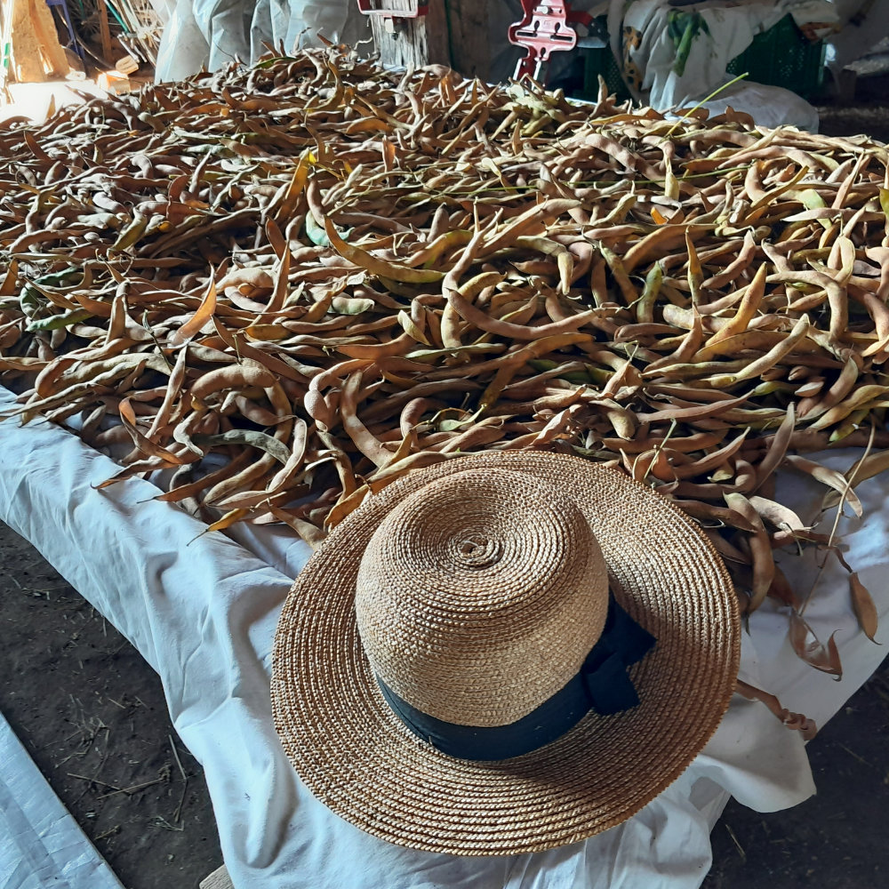 Alte, mittelfrühe Sorte mit typisch weiß-schwarzer Blüte. Guter Ansatz der 10 bis 15 cm langen Hülsen mit je 4 bis 5 Körnern. Bräunt beim Kochen.