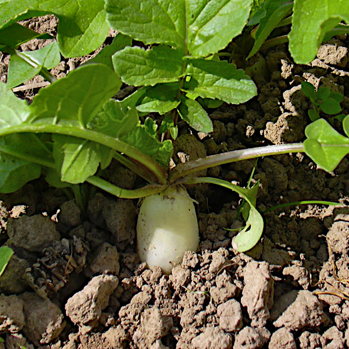 weiß, 10 bis 12 cm lang, eiszapfenförmig. Besonders scharf.