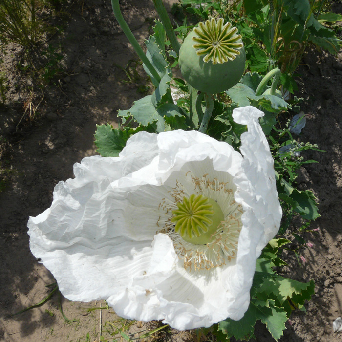 Leuchtend weiße Blüten, sehr große Kapseln mit weißen, süß und wohlschmeckenden Samen der Rest der einjährigen Pflanze ist giftig.