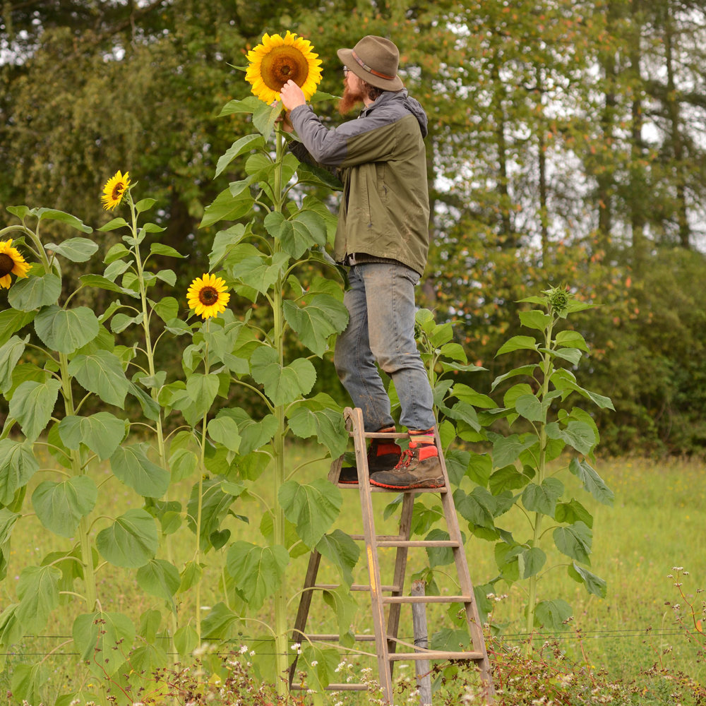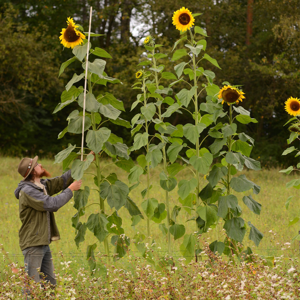 einzelne, bis 45 cm große, gelbe Blütenscheiben auf armstarken, 3 m hohen Stängeln. Als markanter Blickfang im Garten. Schwarze, weiße und rotviolette Kerne.