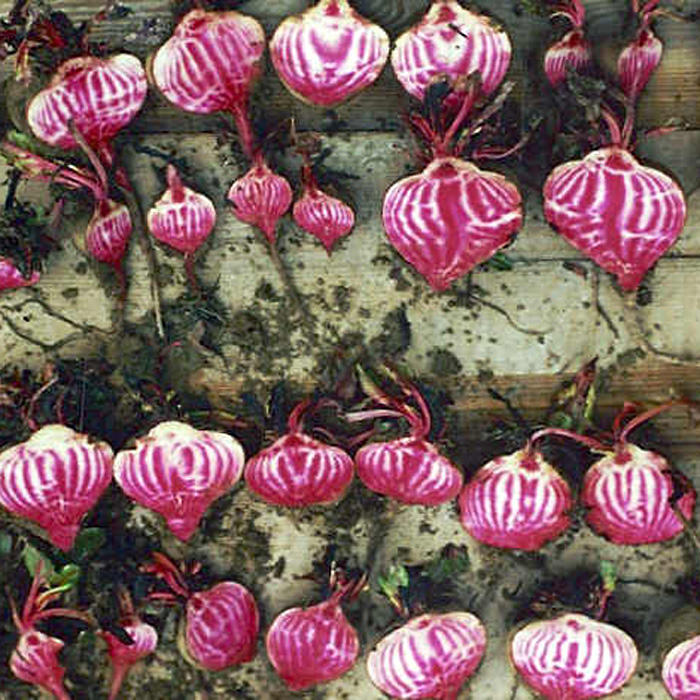 Die Rote Bete Tonda di Chioggia hat eine hellrote Schale und eher kurzes, hellgrünes Laub. Sie ist im Querschnitt leuchtend rot- bzw. pink-weiß geringelt.