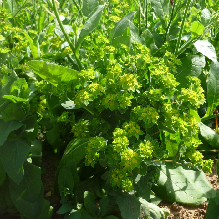 Mit den zweizeilig dicht übereinanderstehenden, bläulichgrünen, stängelumfassenden Blättern und den goldgelben Blüten, die zu mehreren von gelbgrünen Doldenhüllblättern umrahmt werden, erinnert dieser Doldenblütler eher an ein Wolfsmilchgewächs.