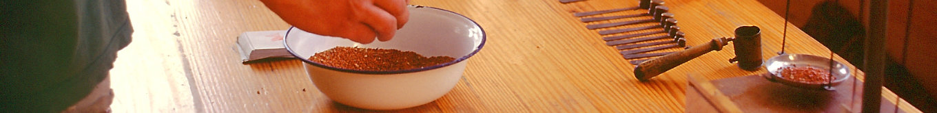 Wie bei den Pflanzen gibt es auch beim Saatgut eine unermessliche Vielfalt: Kugeln, Stäbchen, Nadeln, Plättchen, Häkchen, Puschel, Krönchen, ... und von lupenklein bis daumendick. Bei der Handabfüllung kann alles, was rieselfähig ist, mit Messlöffeln verschiedener Größe in die Tüte gefüllt werden. Wenige große Körner, wie Kürbissamen, von denen je zehn in die Tüte kommen, lassen sich noch auf zwei Blicke zählen, anderes mit einer feinfühligen Prise portionieren. Wenn Tausende von Tüten zu füllen sind, braucht es gut durchdachte Arbeitsabläufe, eine ausgefeilte Arbeitsplatzeinrichtung mit kurzen Greifwegen und einige Übung. Dann können in einer Stunde z.B. von Paprika bis zu 1.500 Tüten gefüllt werden oder 600 Portionen Buchweizen à 200 g. Nach dem Füllen geht es ans Zukleben der Tüten. Geschieht dies von Hand, dauert es etwas länger als das Befüllen. Schneller geht es mit einem "Klebekarussell", einer einfachen Maschine, in welche die Tüten eingesteckt werden und dann auf einem Rad im Kreis herum wandern, mit dem Verschlussstempel versehen werden und am Ende fertig in die Kiste fallen. Auf vier Dreschflegel-Höfen steht ein solches Gerät zur Verfügung. Dort kleben auch einige der benachbarten Betriebe ihre bereits gefüllten Tüten zu.