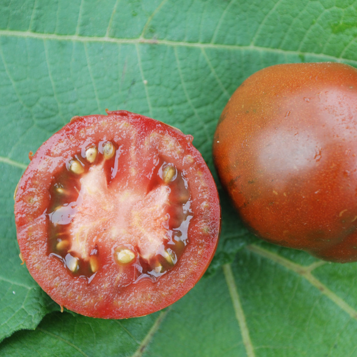 sehr dunkle Tomate mit weichem Fruchtfleisch und einem ihr eigenen, süßlichen, guten Aroma. Ergibt ein fantastisch gefärbtes Mark.