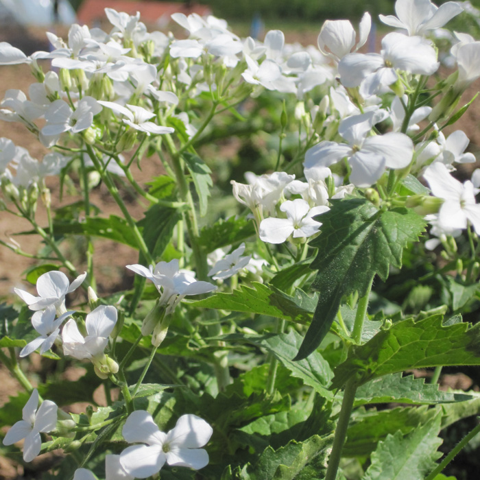 klassische Bäuer*innengartenblume mit dunkelgrünem Laub und weißen Blüten zeitig im zweiten Jahr für Augen und Insekten. Die silbrig-transparenten Mittelwände, die nach dem Aufspringen der Schoten erhalten bleiben, sind sehr beliebt für Trockensträuße. Bis 1 m hoch.
