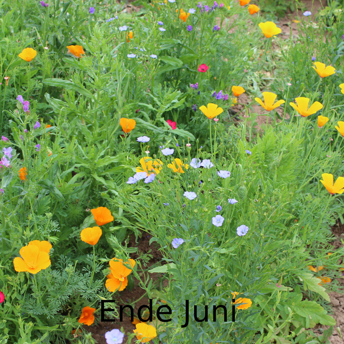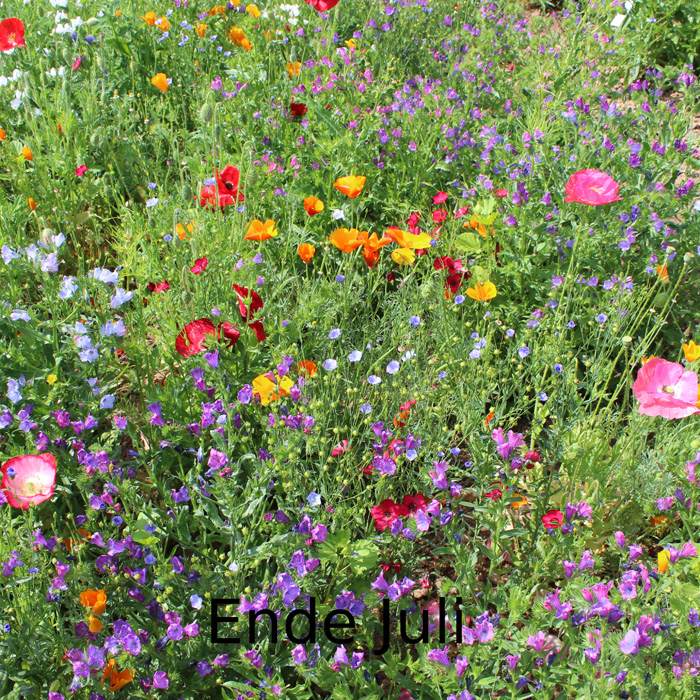 farbenfrohe Mischung einjähriger Sommerblumen. Lein, Goldmohn, Cosmea, Schwefelcosmea, Zinnie, Klatschmohn, Natternkopf, Lanzenrittersporn, weiße Kornrade (giftig!), bis ca. 1 m hoch.