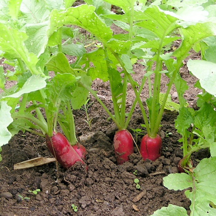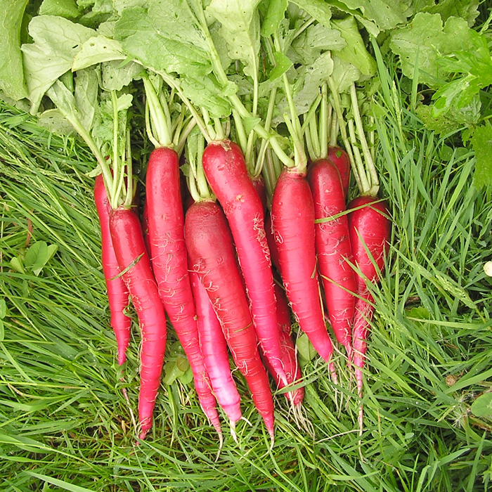lang ovaler, zarter Sommerrettich mit roter Haut, auch für Unterglasanbau.