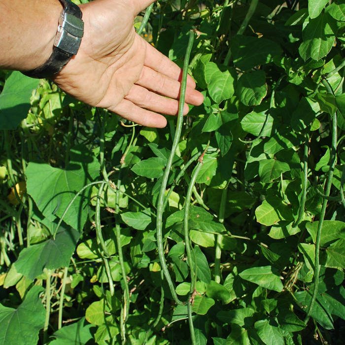 Die vielen, langen Bohnen sollten geerntet werden, wenn sie etwa bleistiftdick und 40-80 cm lang sind.