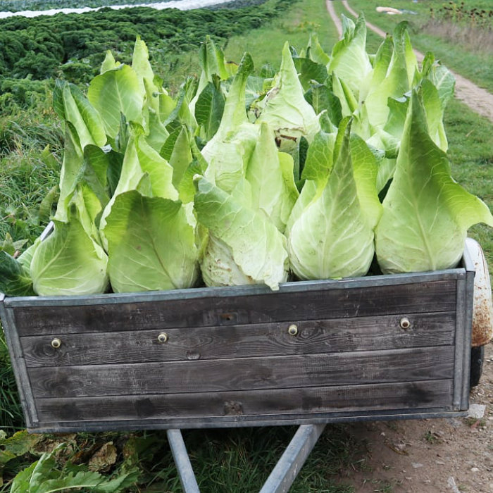 50 cm große, spitz zulaufende Köpfe mit zartem Blatt, für Frischverzehr oder traditionell als schmackhaftes Sauerkraut. Bis April lagerfähig.