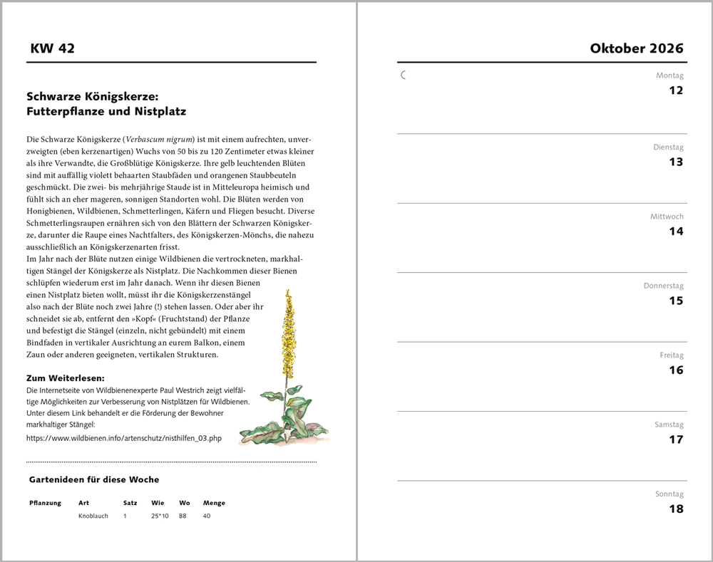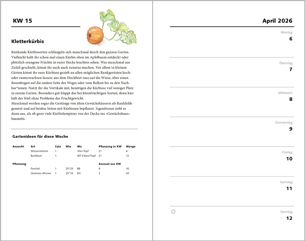Der taschenGARTEN ist ein persönlicher Terminkalender und Gartenplaner mit einem wöchentlichen Aussaat- und Pflanzplan. Viel Praxiswissen zum Anbau von Gemüse und Kräutern machen ihn zum tollen Begleiter im Haus- und Nutzgarten. Zudem informiert er zu Themen wie Klimagerechtigkeit und Biodiversität, denn Gärtnern ist politisch!